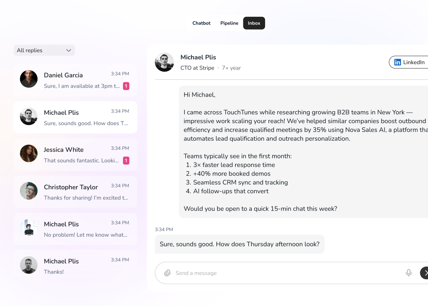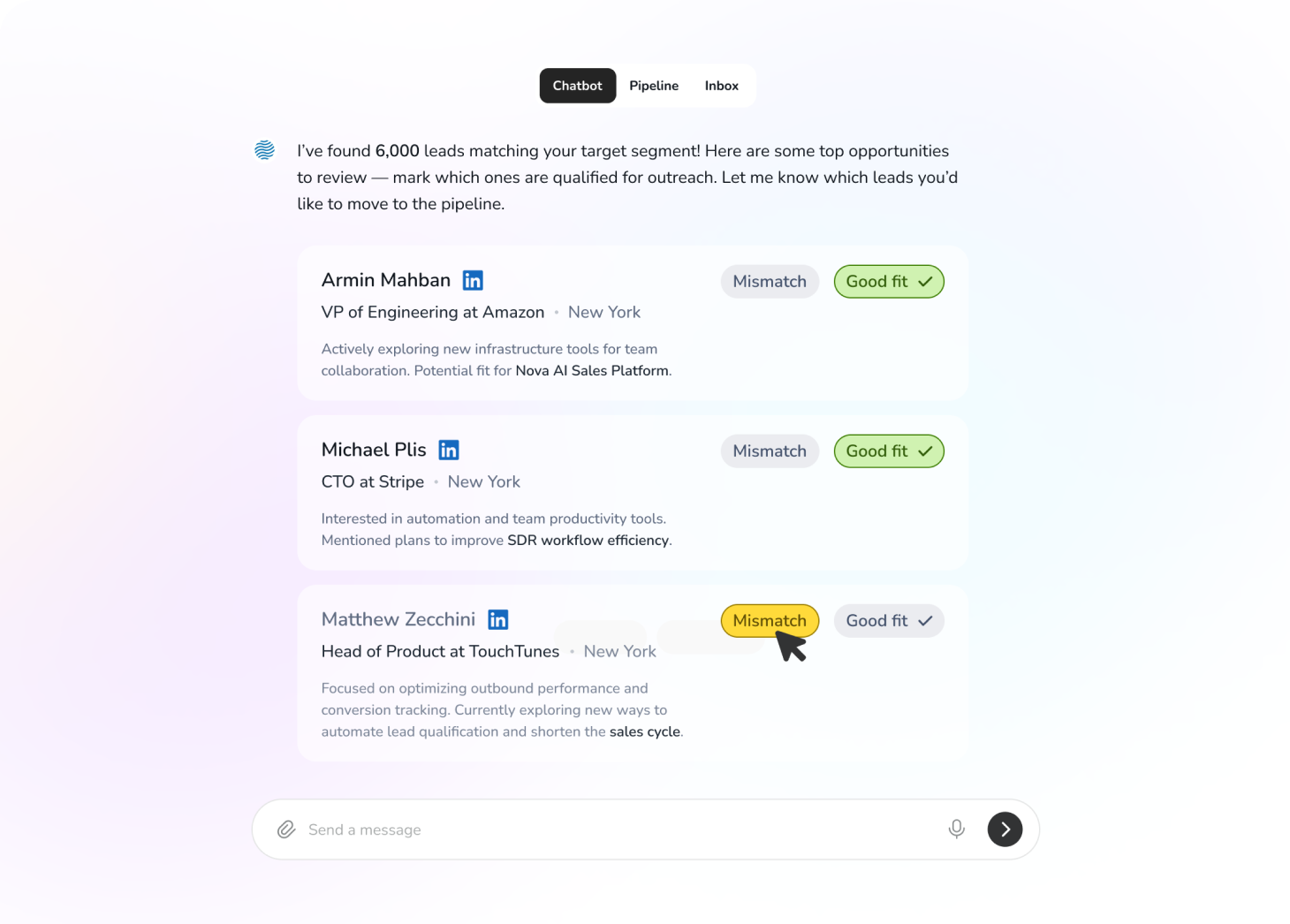 You get a virtual SDR with their LinkedIn profile. Scale the number of profiles as needed and keep your personal LinkedIn account clean. Aira handles all the outreach on LinkedIn, giving you a seamless experience while keeping your professional presence intact.